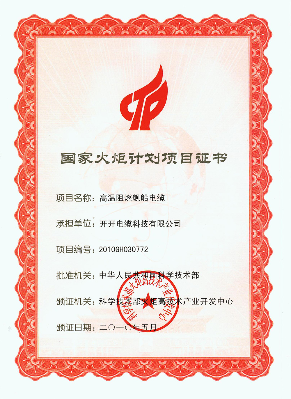 目前,中國科學技術部火炬高技術產業開發中心發布了2010年國家火炬計劃重點高新技術企業評選結果,開開電纜榮膺獲得此獎。